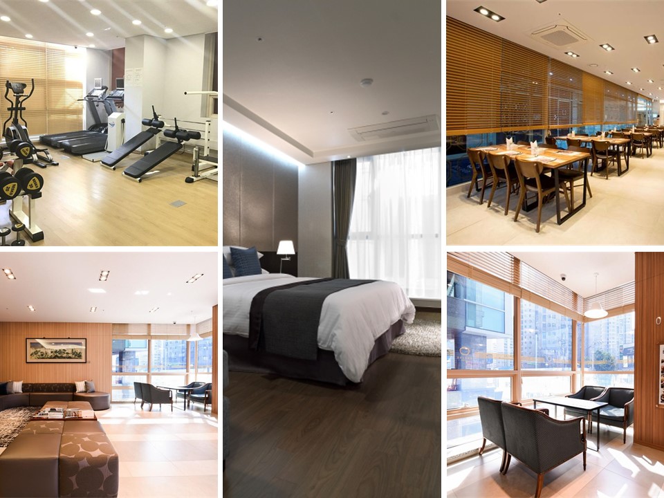객실 시설 : Wi-F,TV,케이블 방송, 매일 하우스 키핑, 샤워실, 전화기, 난방, 세면도구, 책상, 슬리퍼, 커피/티 메이커, 식사 공간, 에어컨, 헤어드라이어, 무료 생수, 세탁기 , 의류건조대, 간이주방, 대형 냉장고