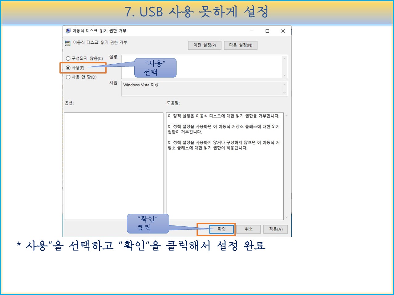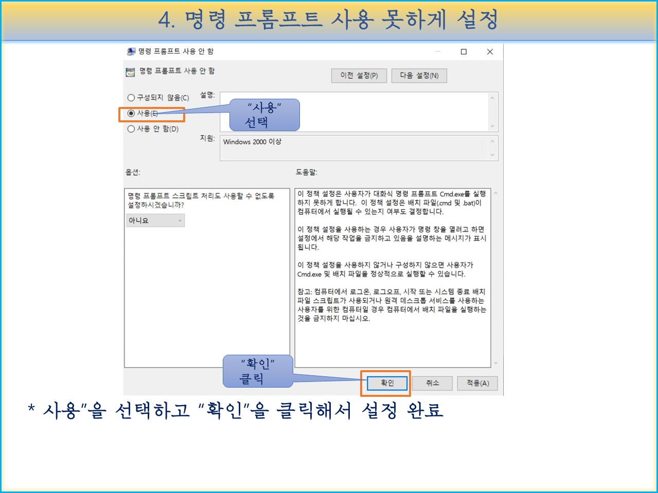 "사용" 을 선택하고 "확인" 을 클릭해서 설정을 완료합니다.