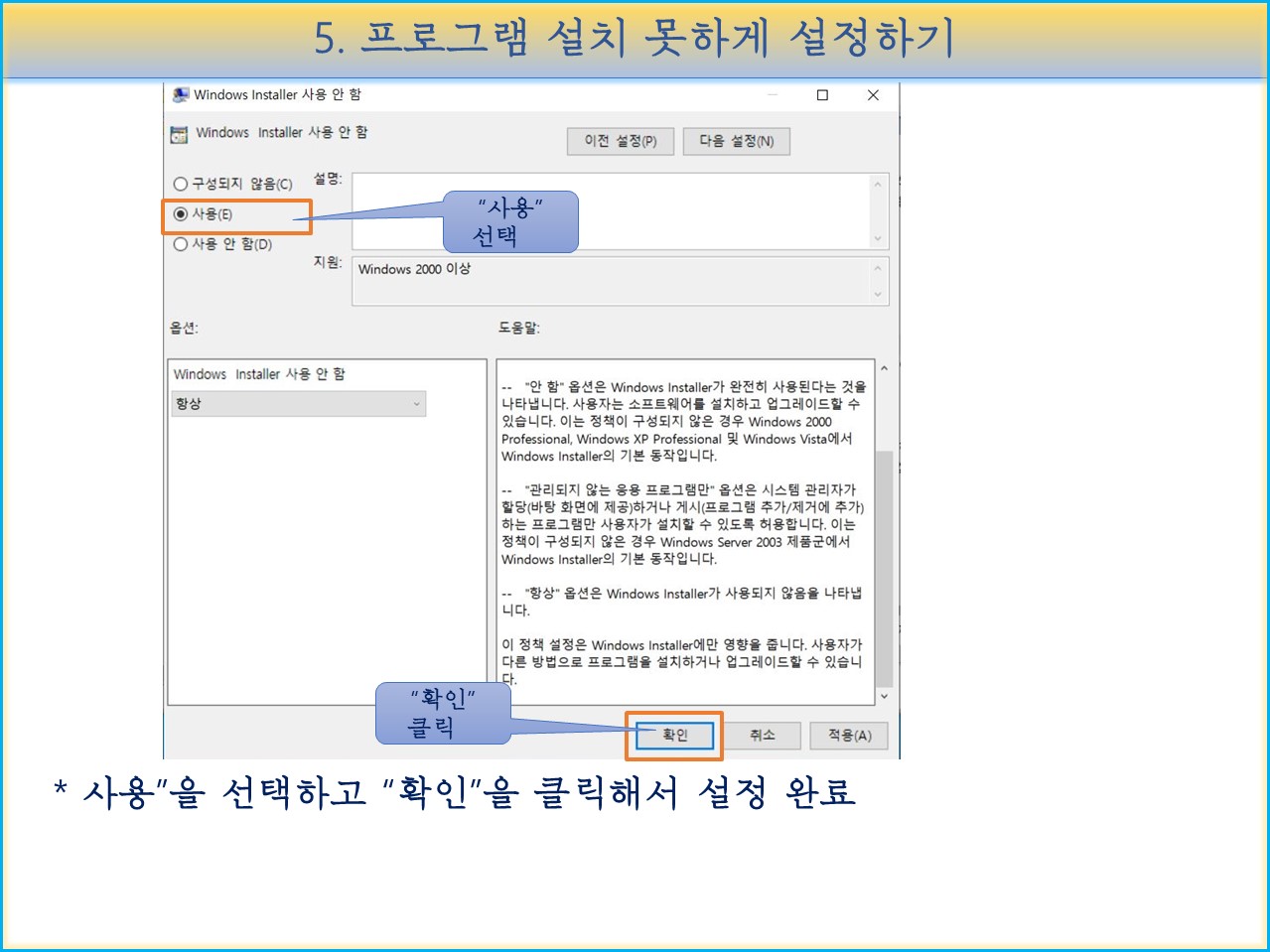 Windows Installer 사용 안함" 을 클릭해서 설정창을 엽니다.