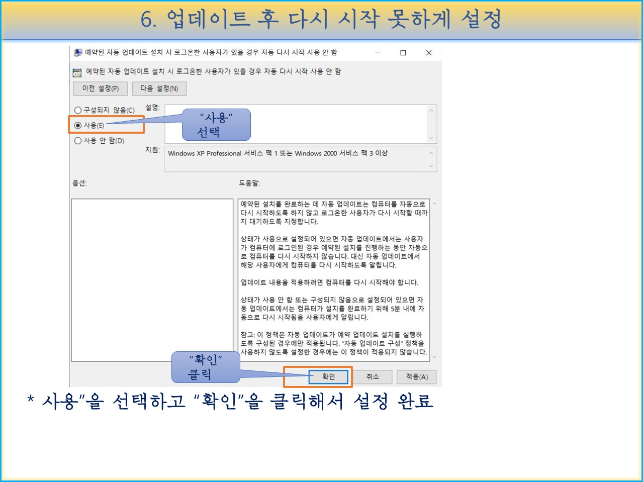 예약된 자동 업데이트 설치 시 로그인한 사용자가 있을 경우 자동 시작 안함"
