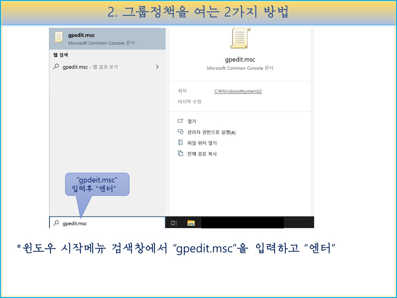 원도우 시작메뉴 검색창에서 " gpedit.msc" 를