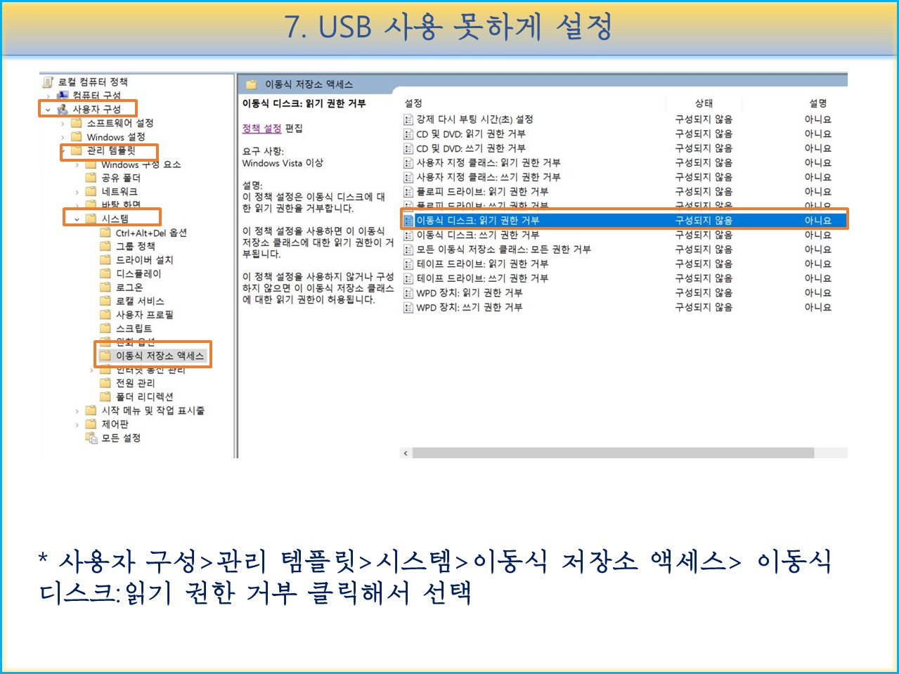 "사용자 구성>관리 템플릿>시스템>이동식 저장소 액세스>