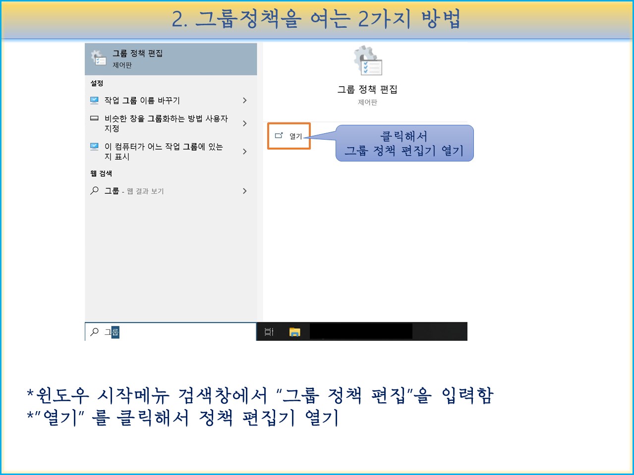 원도우 시작메뉴 검색창에서 " 그룹 정책 편집" 을