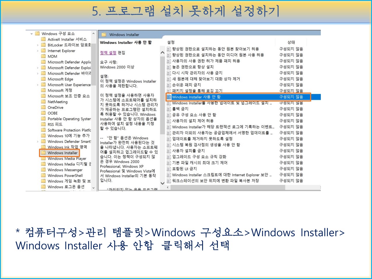 "컴퓨터구성>관리 템플릿>Windows 구성요소>Windows Installer>