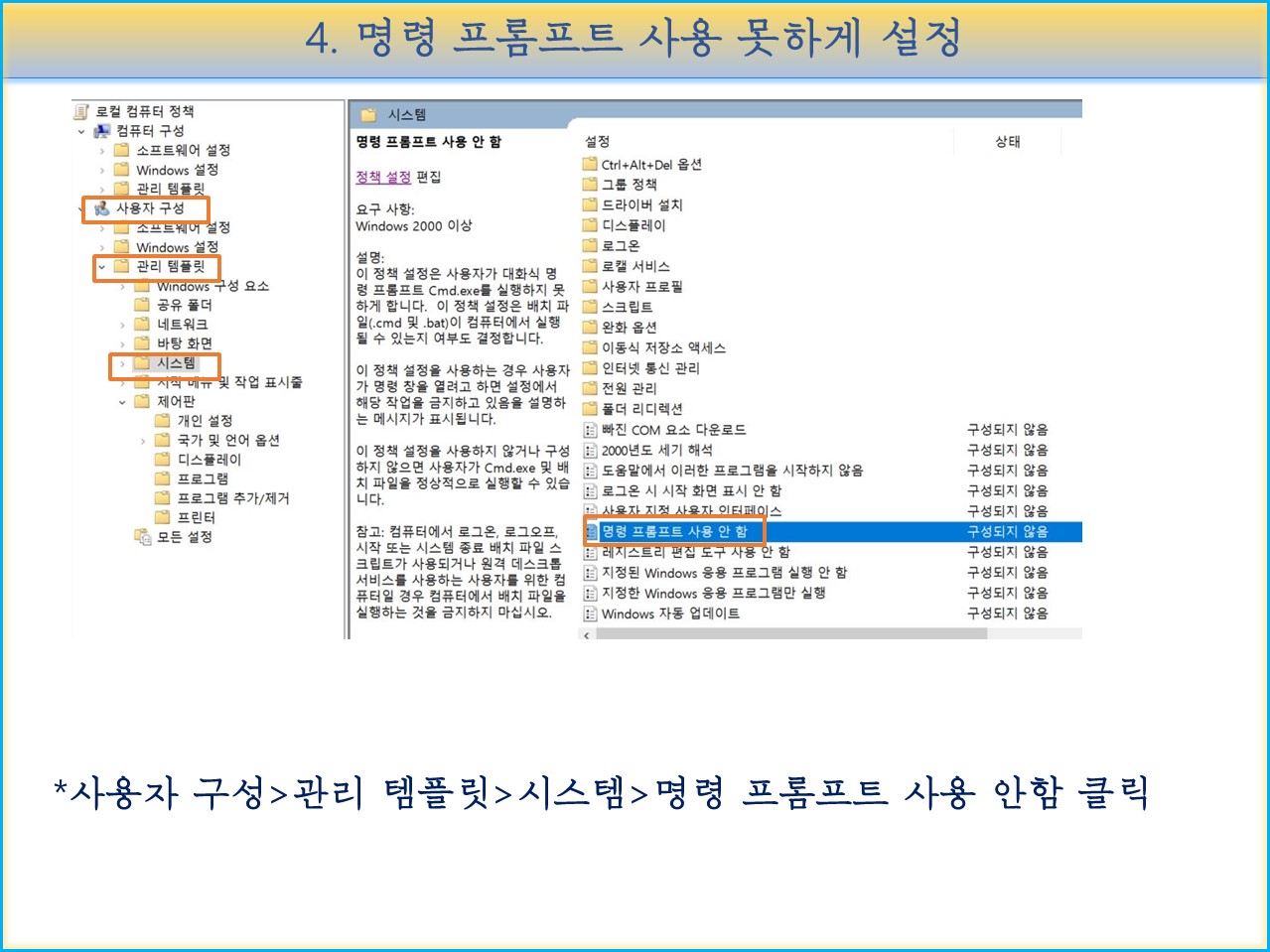 "사용자 구성>관리 템플릿>시스템>명령 프롬프트 사용 안함" 을 클릭합니다.