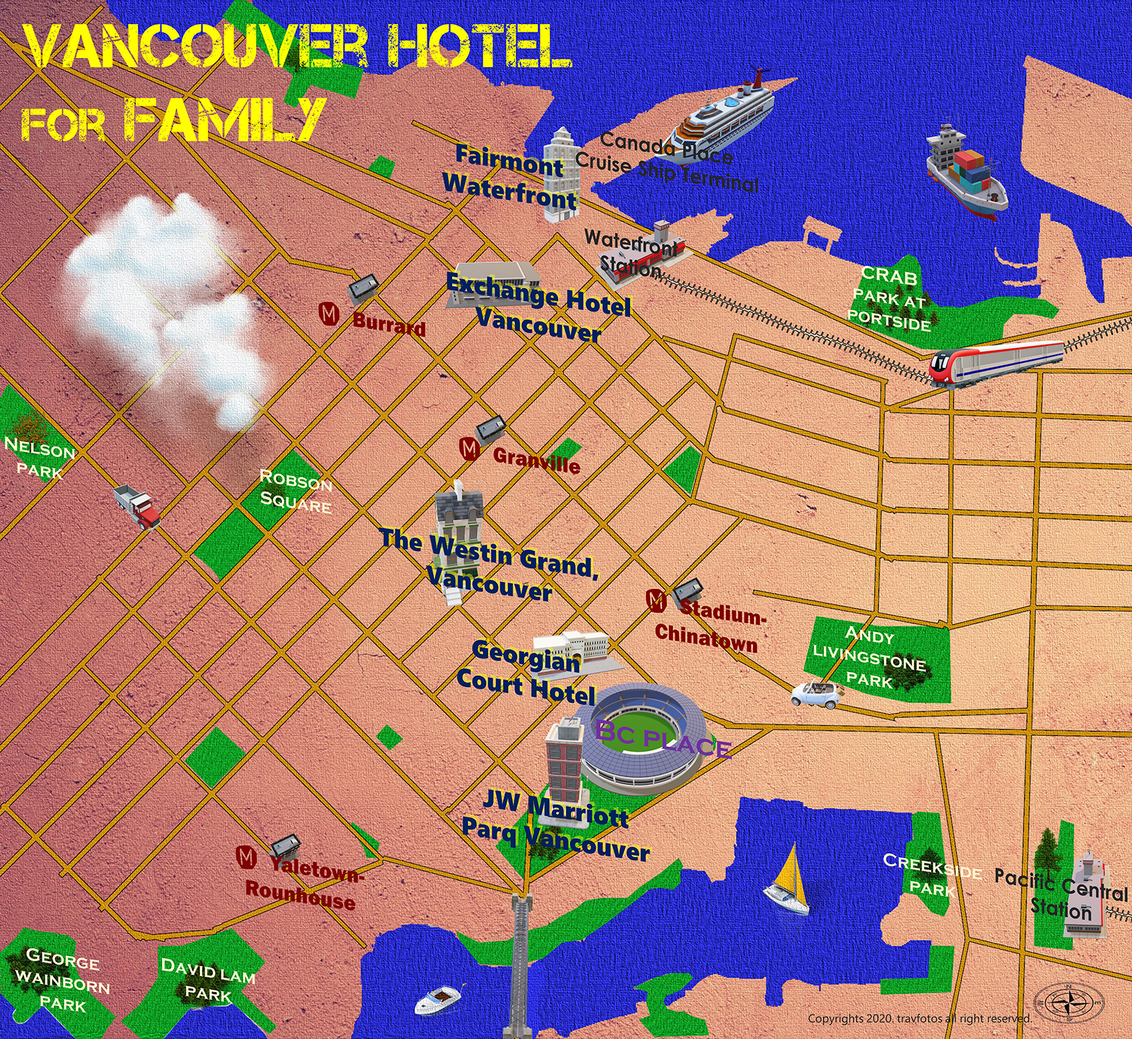 교통: 주자창( CAD 30) ,밴쿠버 국제공항 대중교통으로 35분, 퍼시픽 센트럭 역에서 도보로 20분 거리, 지하철 스타디움 차이나타운역 도보 4분,셔틀서비스