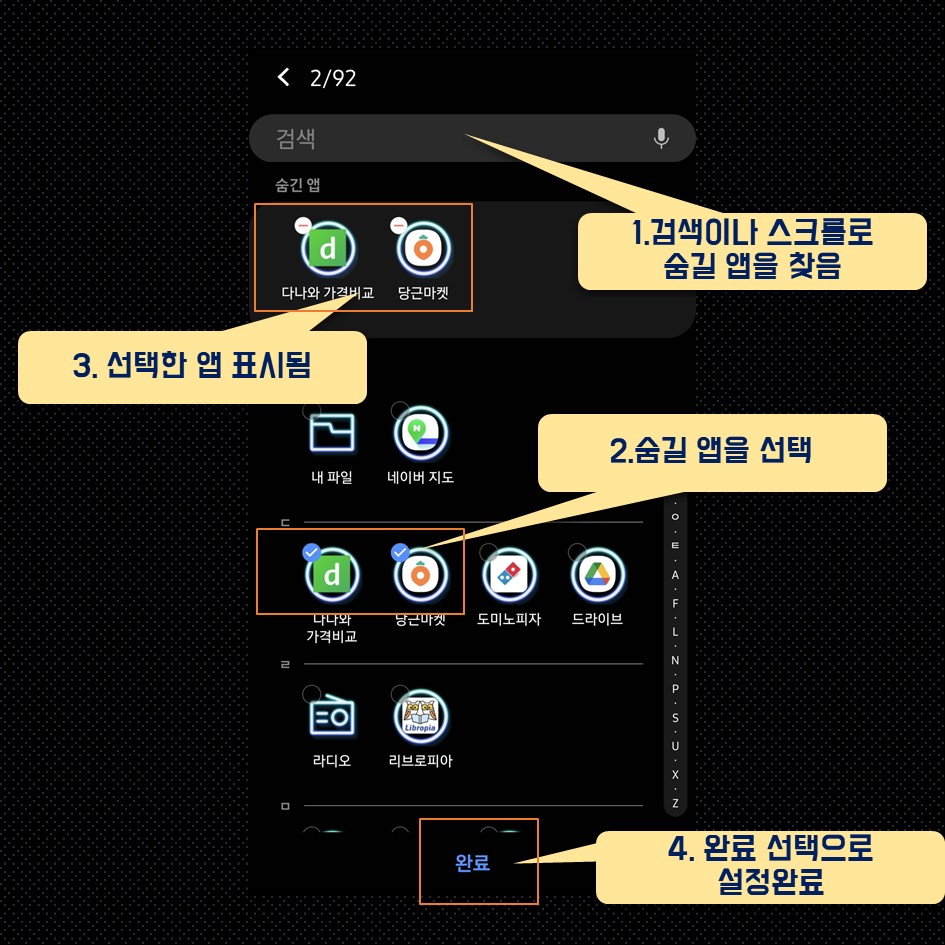 4. 숨길 앱을 선택한 후 완료를 터치하면 설정이 완료가 됩니다.