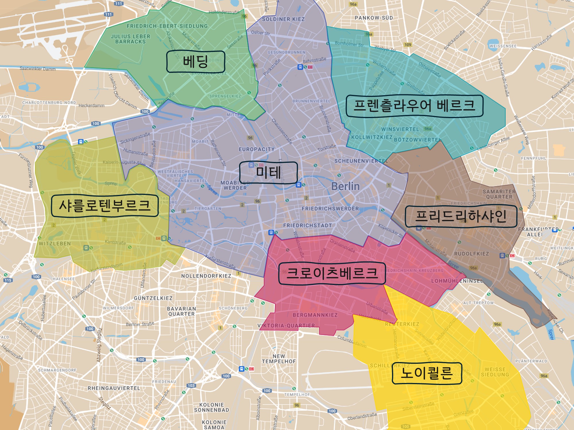 베를린은 넓게 펼쳐진 도시지만 베를린을 방문하는 많은 관광객들은 중심가인 미테에서만 시간을 보내는 경우가 많습니다. 베를린은 12개의 행정구역으로 나뉘어 있으며 행정구역은 개성이 있는 각각의 지역으로 더 세분되기도 합니다.