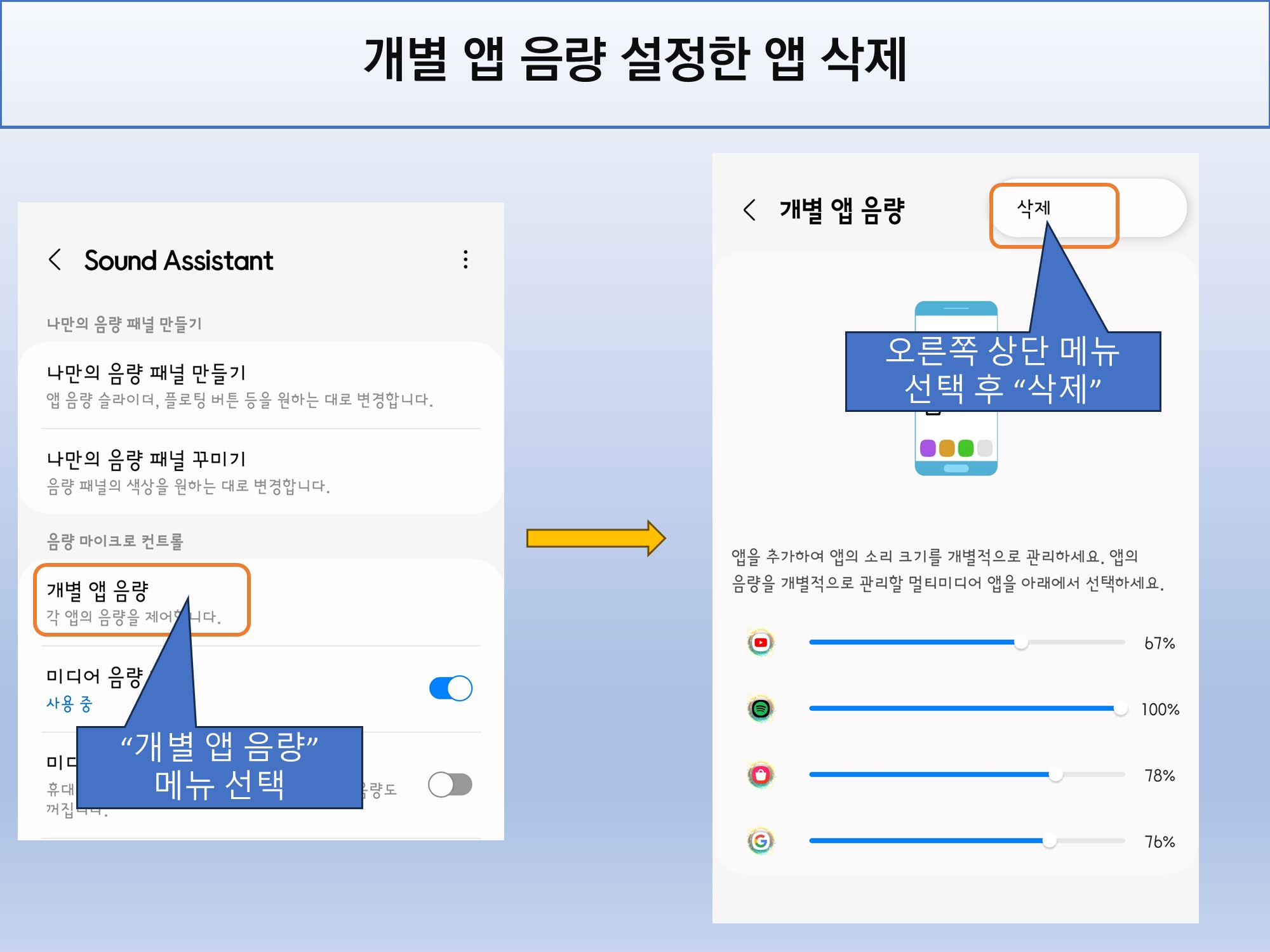 개별 앱 음량 설정 삭제를 원하는 앱을 선택하고 삭제를 선택합니다.