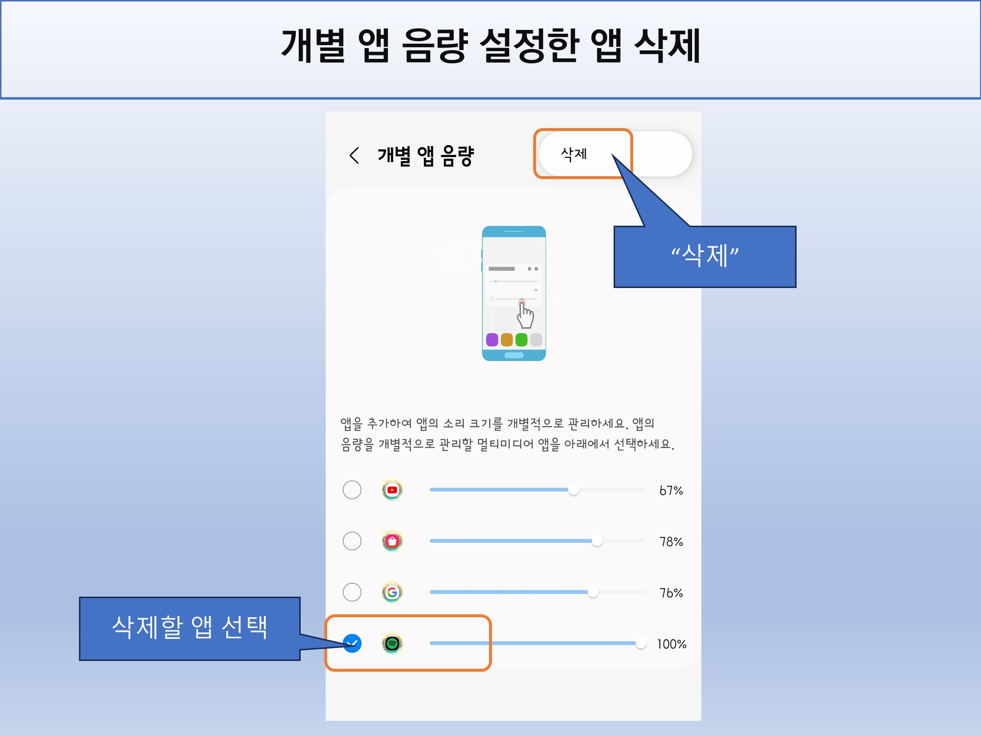 앱을 잘못 선택했거나 이용 중 개별 음량 설정이 필요 없어진 앱이 있을 경우에는 삭제할 수 있습니다.