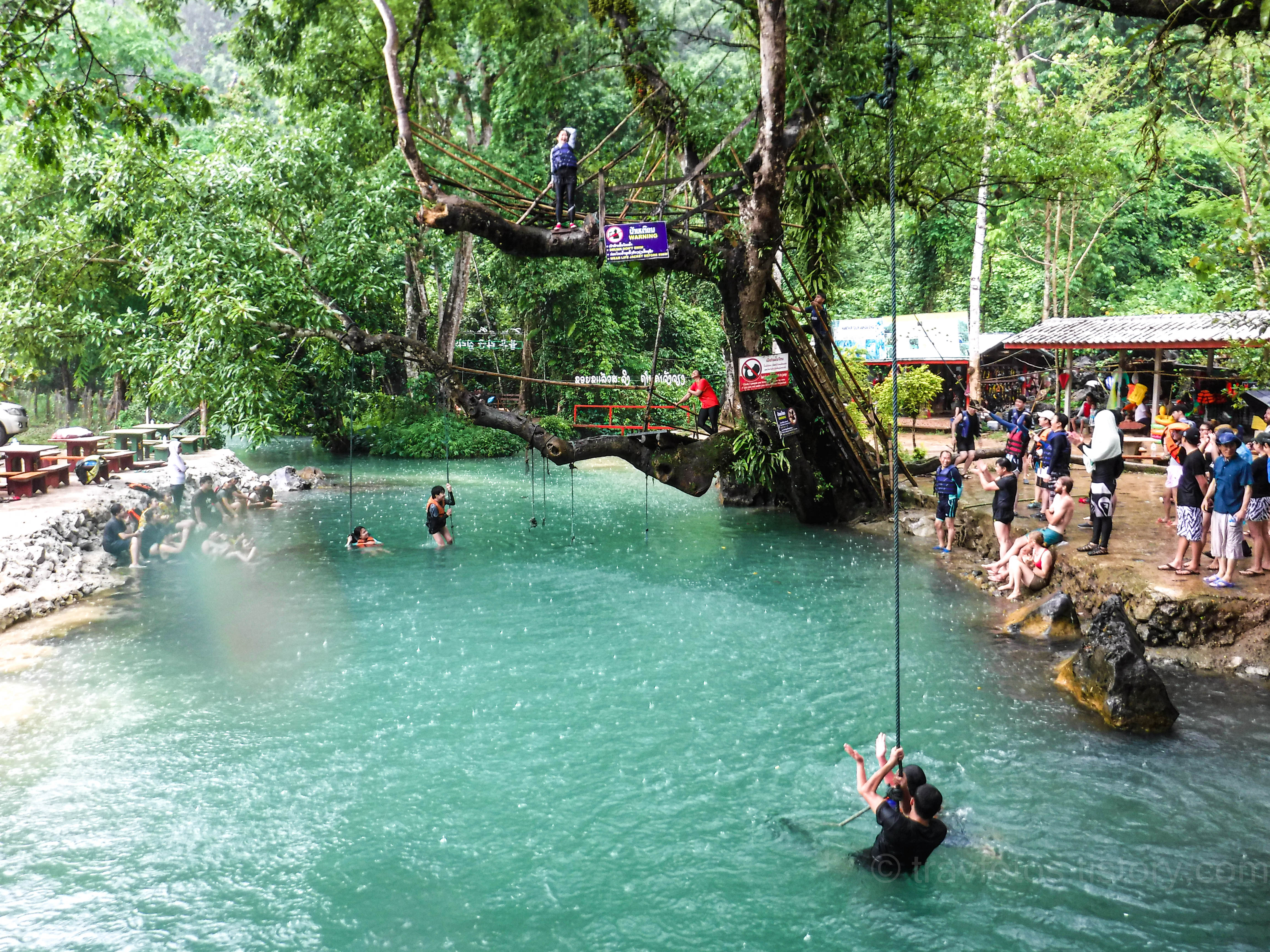 방비엥에서 가장 인기있는 명소는 탐 푸 캄(Tham PhuKham) 으로 불리는 블루 라군으로 방비엥 시내에서 서쪽으로 7km 떨어진 곳에 위치하고 있습니다. 많은 TV 프로그램에 나와 유명한 블루 라군은 에메랄드 빛의 물웅덩이로 직접 보면 실망할 수도 있지만 수심이 깊어서 물놀이와 그네, 다이빙을 즐길 수 있습니다.