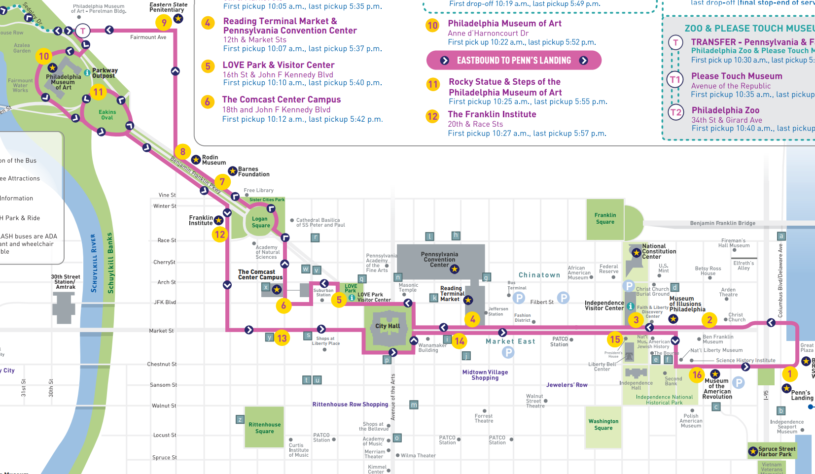 필라델피아는 걷기 좋은 도시로 인기 명소, 대중 교통 이용을 위한 표지판도 잘 갖추어져 있습니다. 많은 명소들이 도보 거리에 위치하고 있습니다.