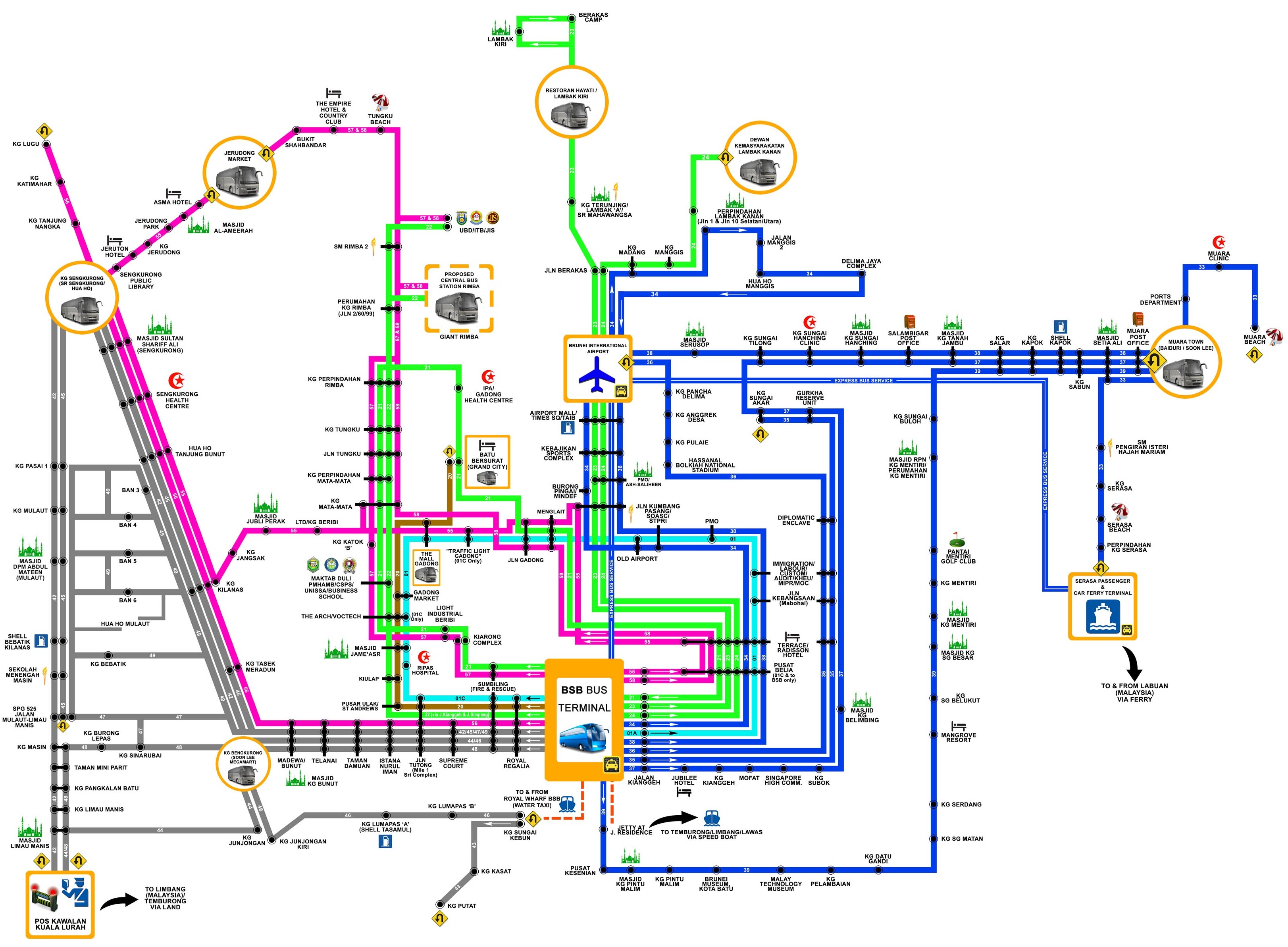 23,24,34,36,38 번 노선은 공항을 통항을 경유합니다. 거리에 관계없이 정액 요금으로 1 BND 으로 하차 시 운전기사에게 현금으로 직접 지불할 수 있습니다.